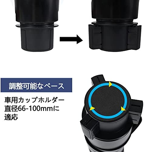 様々な車又トラックなどに適用できる。ベース直径約66?100mm調整可能、カップホルダーを回転させることでベースの固定キーが出てきて車のカップ槽によって調整可能。固定キーの端には滑り止めのシリコンシートが取り付けられて、落下を効果的に防ぎます。ベースの底部には耐衝撃フォームが装備され、衝突音や揺れを低減し、より安定して使用することができます。