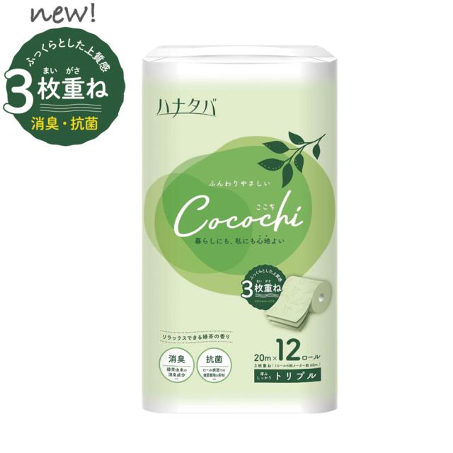 トイレットペーパー 丸富製紙 ハナタバ Cocochi ココチ 緑茶の香り 消臭機能 3枚重ね20m 12ロールX6パック