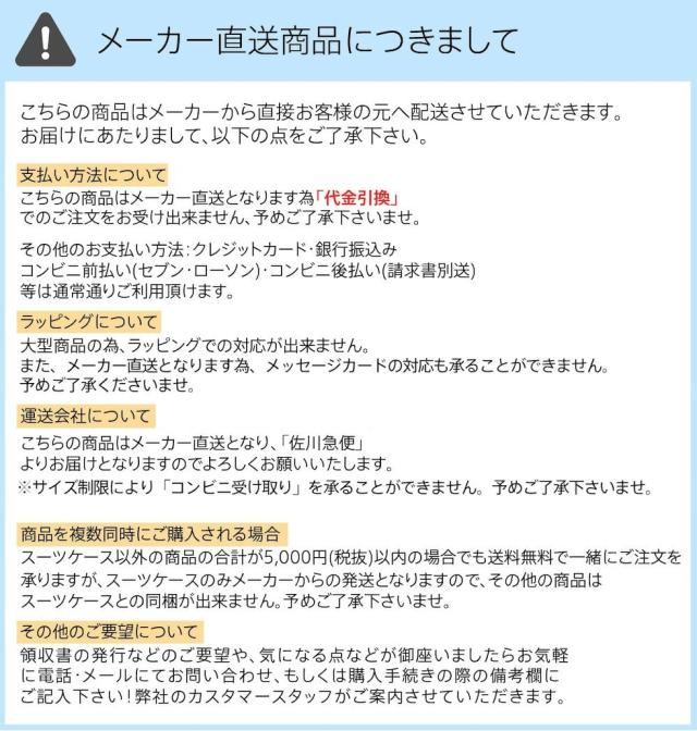 | 備考 | 機内持込対応:× 無料受託手荷物(158cm以内):〇 開閉部:フレームタイプ キャスター:ダブルキャスター(合計8輪) | ||
