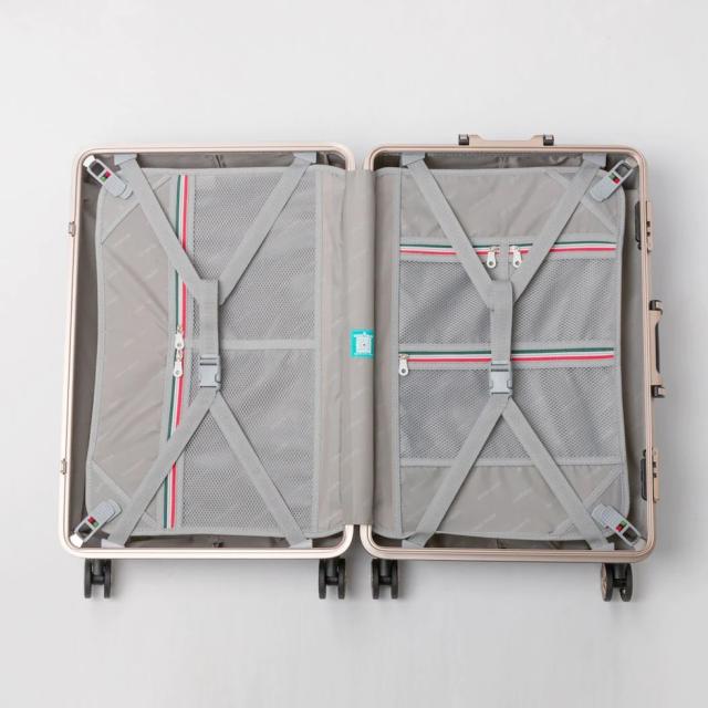 ケース内は前後両方のシェルに、荷物をしっかり固定できるX字バンドと、小物の仕分けに便利なメッシュポケット付中仕切りを装備しています。