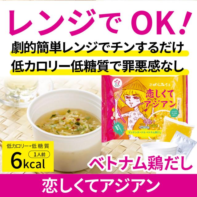ベトナム鶏だし こんにゃく麺 スープ 12食 こばらみちる 恋しくて アジアン お湯いらず 低カロリー 低糖質 100gあたり6kcal レンジで簡単 お湯いらず マンナン 蒟蒻 こんにゃく ヌードル 備蓄 備蓄食 食料 備蓄品 お肉の しゃぶまる