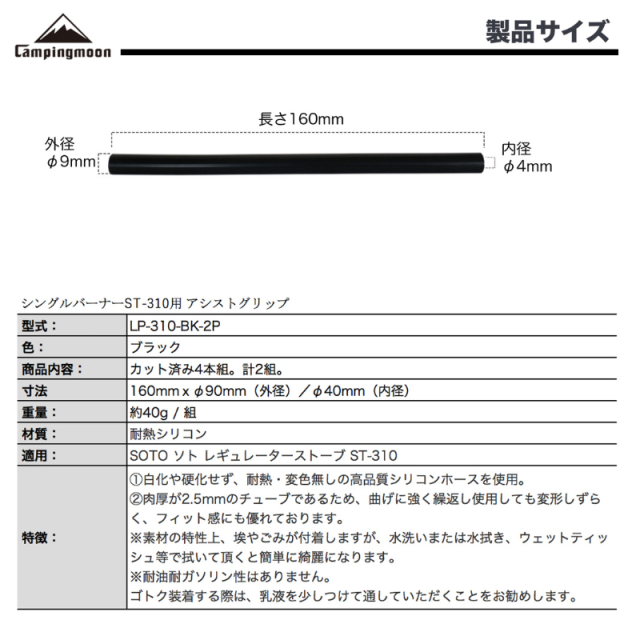 キャンピングムーン(CAMPING MOON) シリコン φ4mm ST-310 シングルバーナー用 アシストグリップ シリコンチューブ 2組 耐熱 カット済み ブラック 黒ギア LP-310-BK-2P