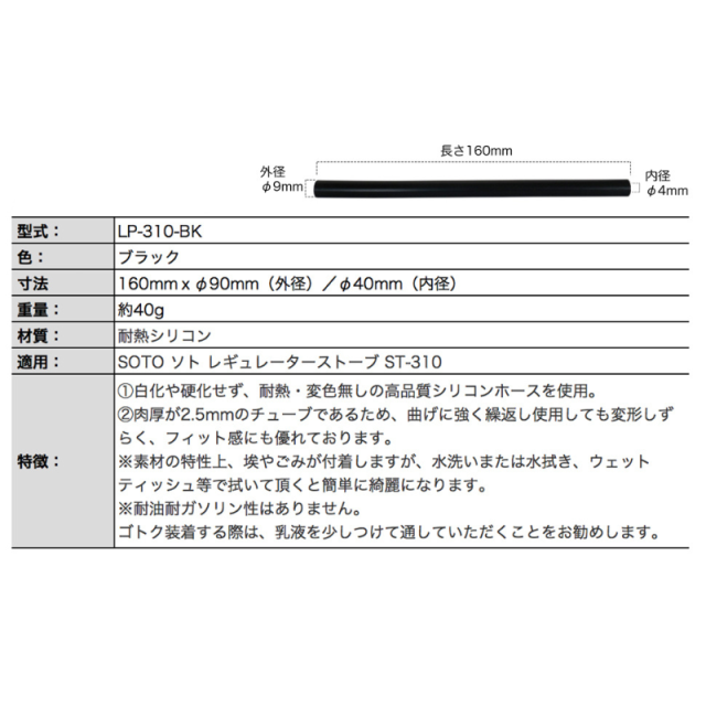 ・ST-310の径長に合う内径φ4mmのシリコンホースで、新富士バーナー、SOTO製のシングルバーナー、レギュレーターストーブの脚の滑り止めにも相性が良いです。