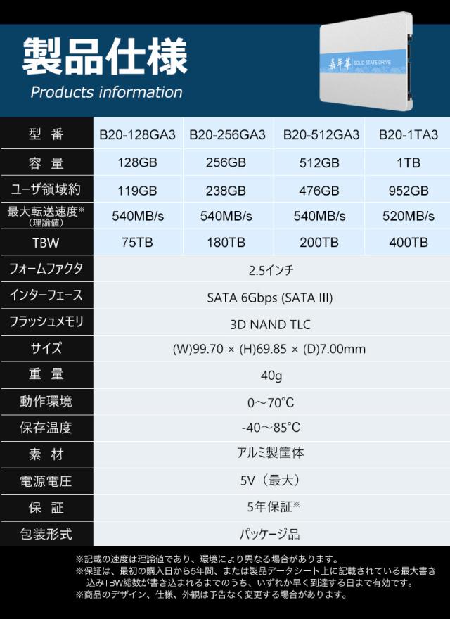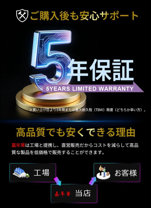 保証:JNHショップにて安心の国内サポートと5年保証(保証は、最初の購入日から5年間、または製品データシート上に記載されている最大書き込みバイト総数180Terabytesが書き込まれるまでのうち、いずれか早く到達する日まで有効です。 ご購入前に必ずご確認ください。)
