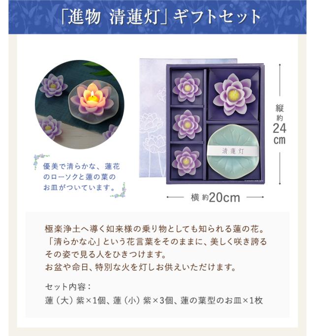 ◎内容量:清蓮灯(紫) キャンドル(大サイズ1個、小サイズ3個)、蓮の葉型のお皿1枚