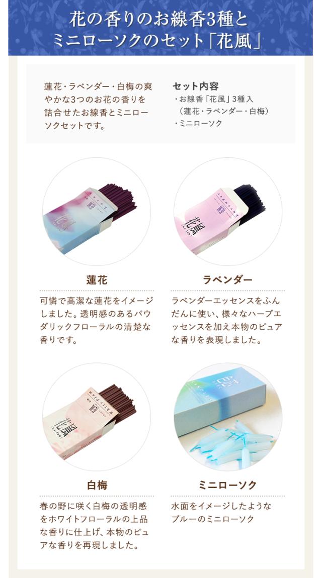 ■日本香堂 お線香セット◎内容量:花風(線香3箱:ラベンダー 約60g / 白梅・蓮花 各約54g 燃焼時間:約25分)、ミニローソク