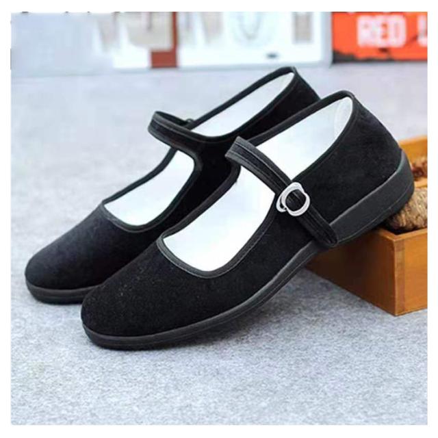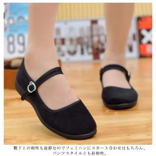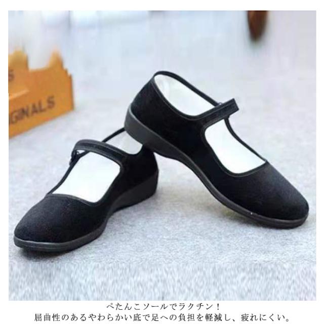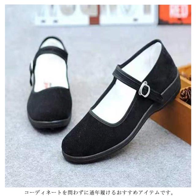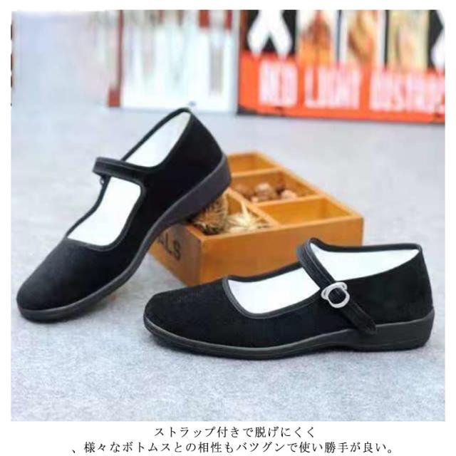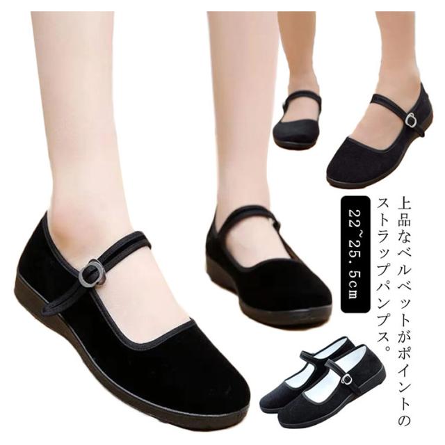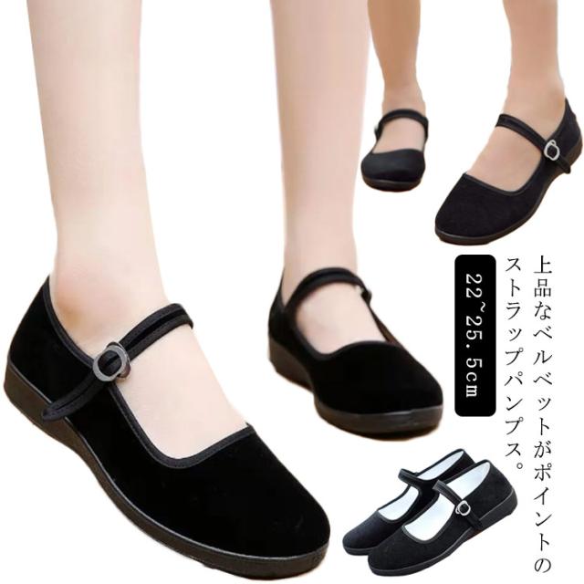 ベルベット ストラップシューズ パンプス ぺたんこ ローヒール ストラップ カンフーシューズ チャイナシューズ ワンストラップ ベルト ベロア スエード フラット シューズ 黒 通勤靴 レディース 22~25.5cm