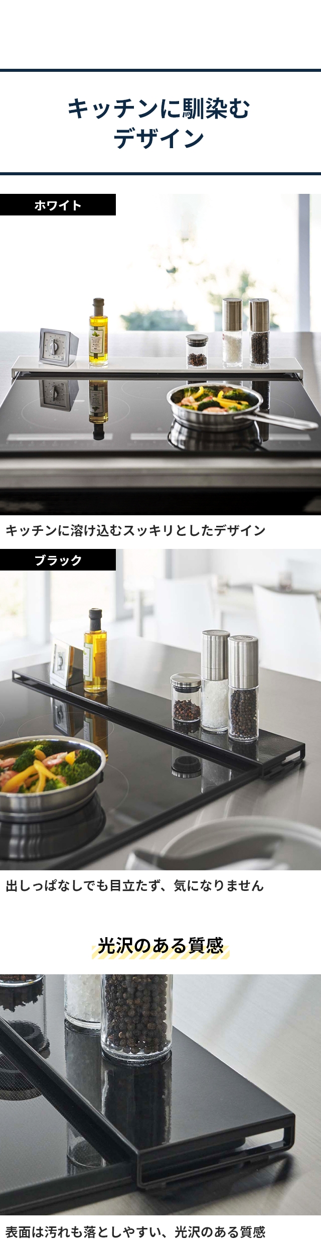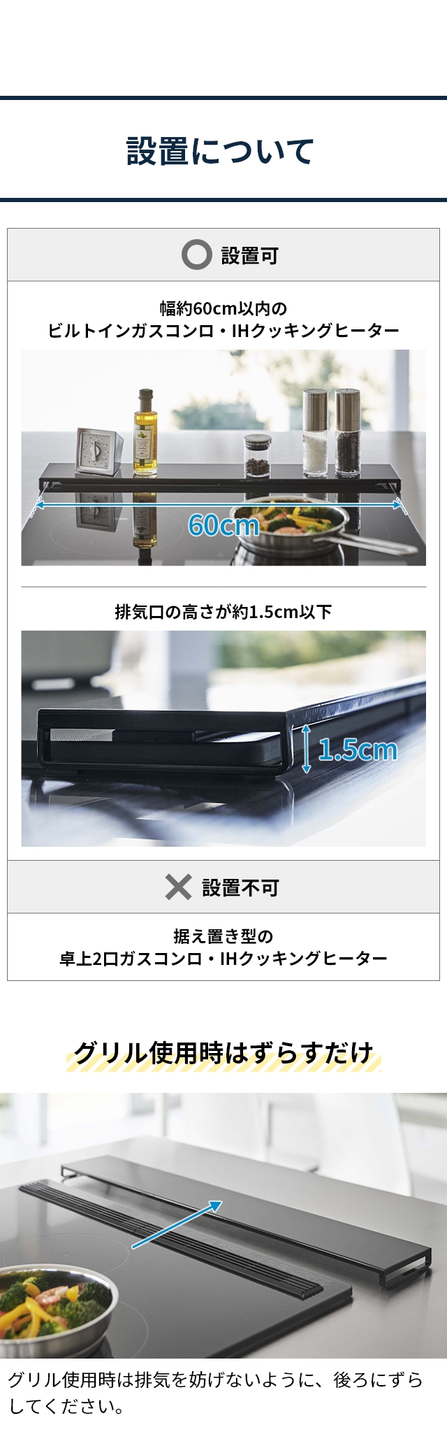 フラットなので、調味料を置いたり、フライパンや鍋の一時置きにも◎一般的なコンロ幅60cmに対応しています。