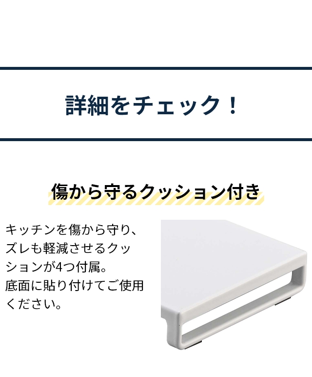 | ●サイズ 約幅63×高さ2.5×奥行き10(cm) ●重量 約900g ●材質 [本体]スチール(粉体塗装) ●耐荷重 約3kg ●同梱物リスト クッション×4 ●耐熱温度 約200℃ ●対応サイズ [ビルトインガスコンロ・IHクッキングヒーターの幅]約60cm以内 [排気口の高さ]約1.5cm以下 |