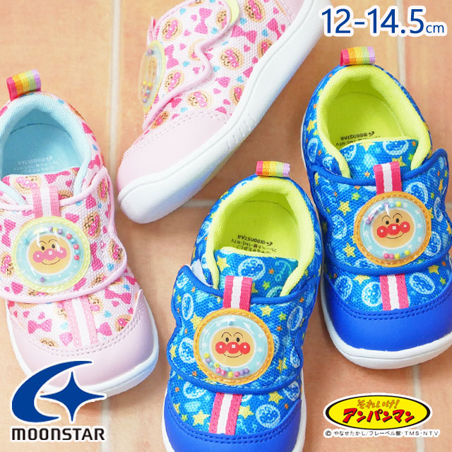 キッズ ベビー 男の子 女の子 FW 秋冬 新作 2022 秋新作 冬新作 スニーカー ファーストシューズ ベビーシューズ ローカット 人気 流行 定番 Moonstar AP B43 それいけ アンパンマン 子供靴 ベルクロ 洗えるインソール ブルー ピンク 総柄