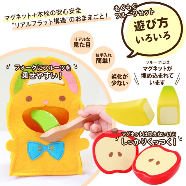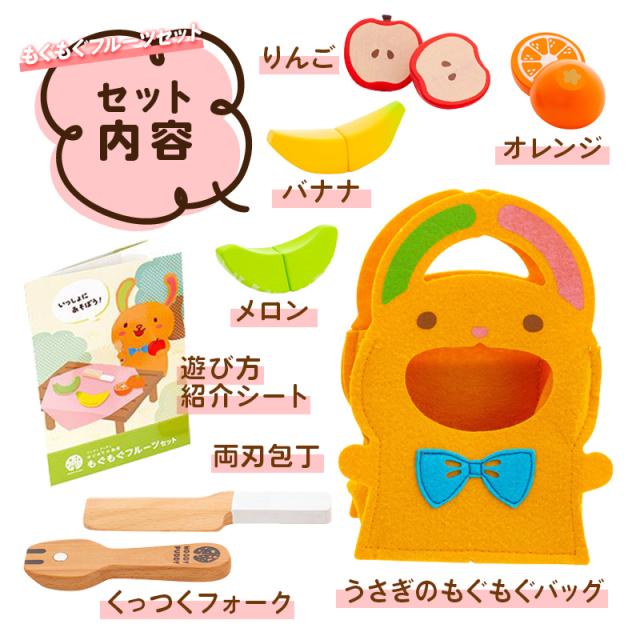 ・りんご、バナナ、オレンジ、メロン、フォーク、包丁、うさぎのもぐもぐバッグ、遊び方紹介シート ×各1