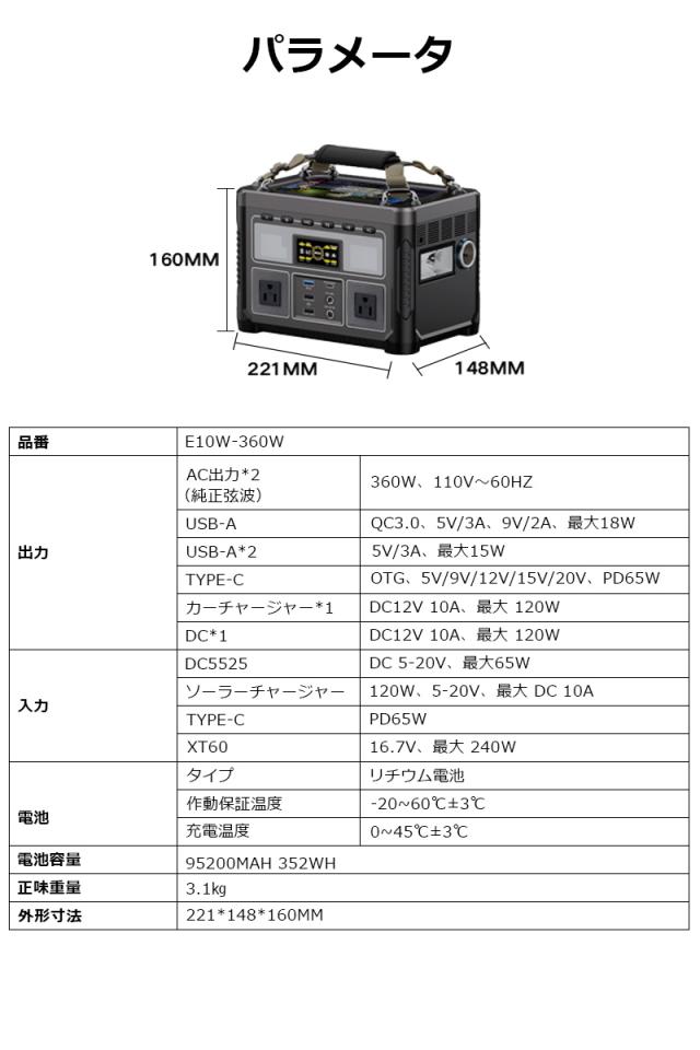 ポータブル電源 95200mAh大容量 防災電源 352Wh AC 360W/USB-A/DC出力 ソーラー充電対応 家庭用蓄電池 【PL保険加入済み製品・安心】