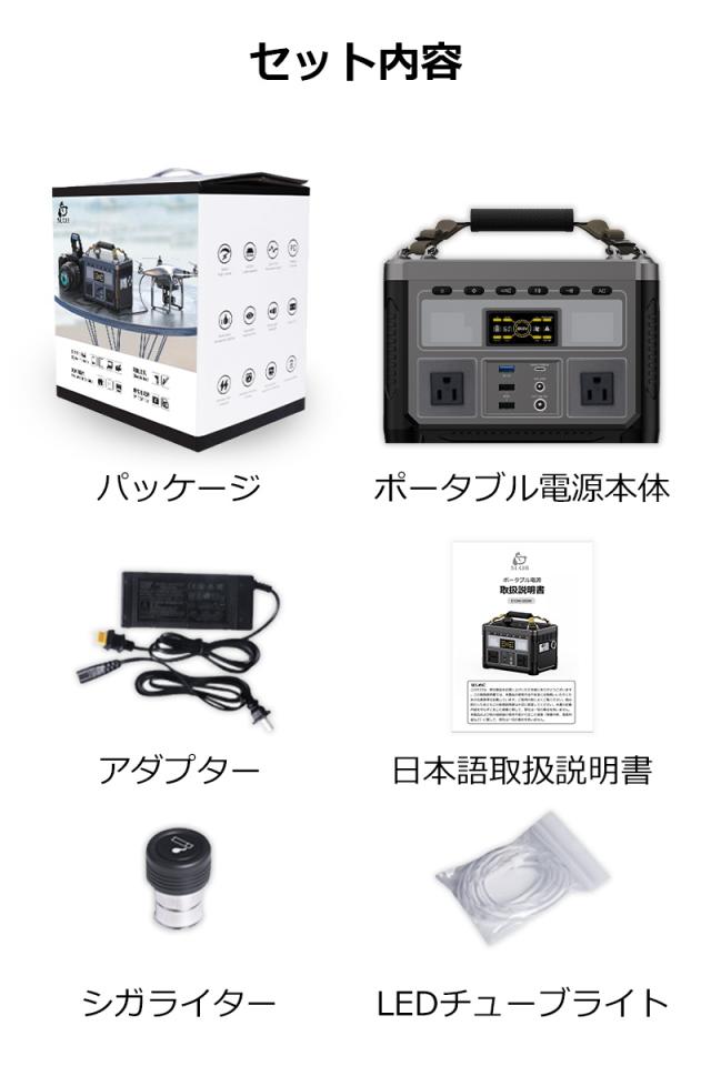ポータブル電源本体、シガライター、電源アダプター、LEDチューブライト、日本語取扱説明書