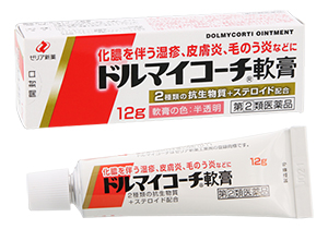 ドルマイコーチ軟膏は、抗菌作用を有する2種類の抗生物質のバシトラシンとフラジオマイシンを配合、さらに痒みと炎症を抑える副腎皮質ホルモンのヒドロコルチゾンを配合しており、細菌感染症、炎症性の両方に効果を発揮します。かきくずし、化膿しそうな湿疹に適しています。効能が広いので、ご家庭に一つおいておくととても便利な軟膏剤です。