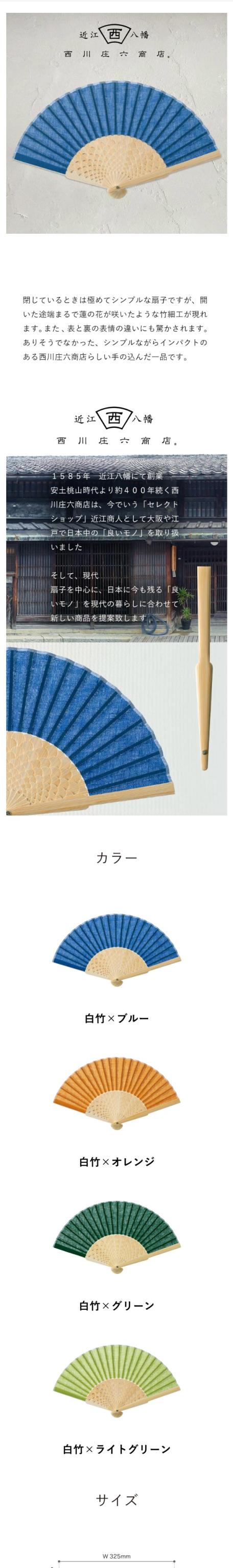 閉じているときは極めてシンプルな扇子ですが、開いた途端まるで蓮の花が咲いたような竹細工が現れます。 また、表と裏の表情の違いにも驚かされます。 ありそうでなかった、シンプルながらインパクトのある西川庄六商店らしい手の込んだ一品です。