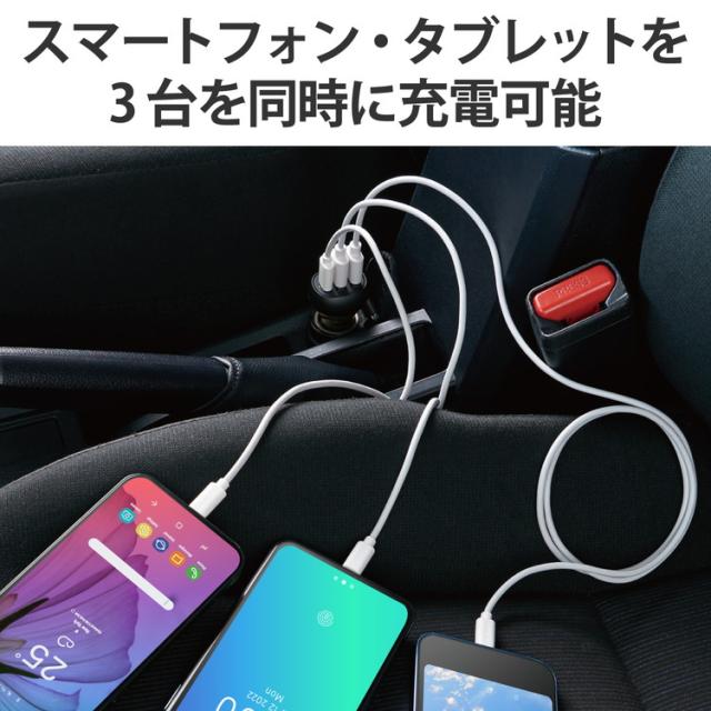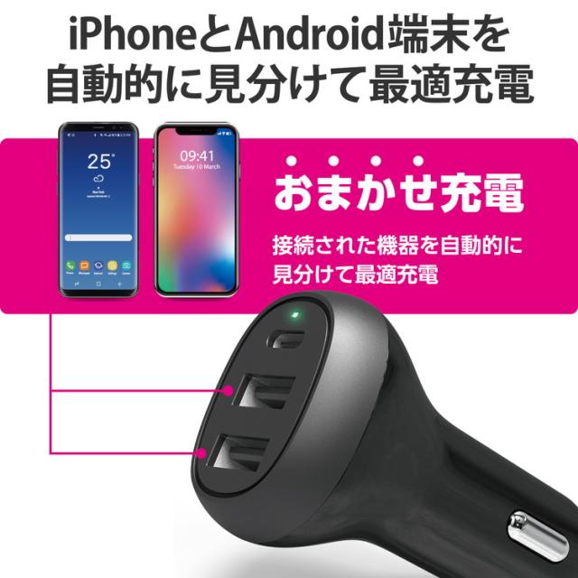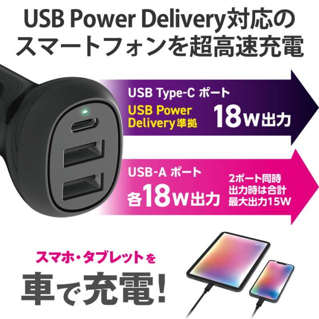 USB Power Delivery規格に準拠したUSB Type-C(TM)(USB-C(TM))ポート1つと、USB-Aポートを2つ搭載し、スマートフォンなどを合計3台充電できる車載充電器。合計最大出力36Wで高速充電が可能。