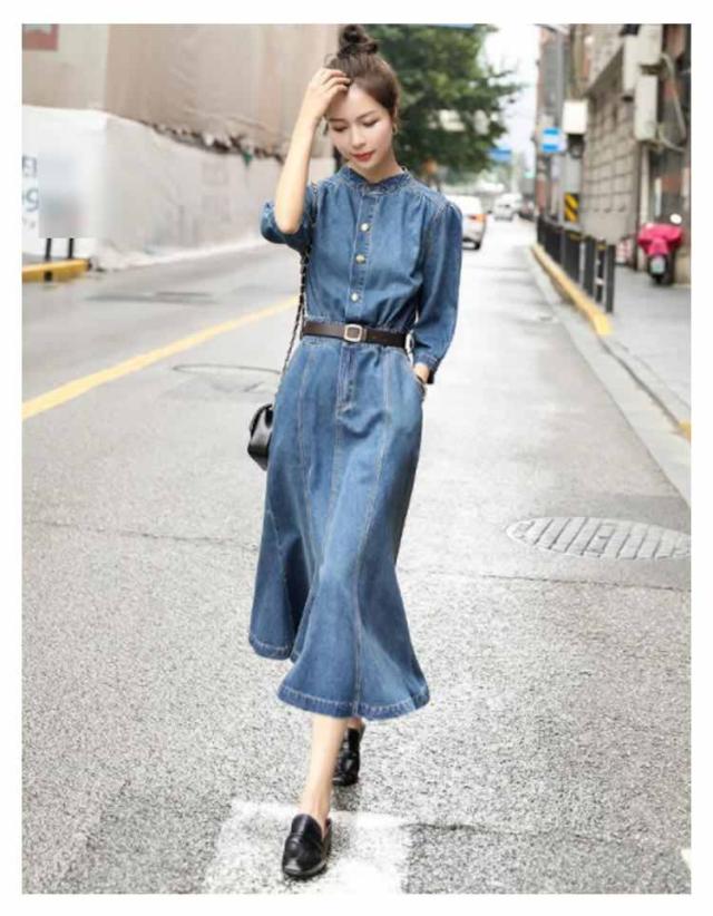 デニムワンピース レディース 春秋 七分袖 ロングワンピース ロング丈デニムワンピース ロング きれいめ 無地 マーメイドワンピース パーティードレス ファッション お出かけ