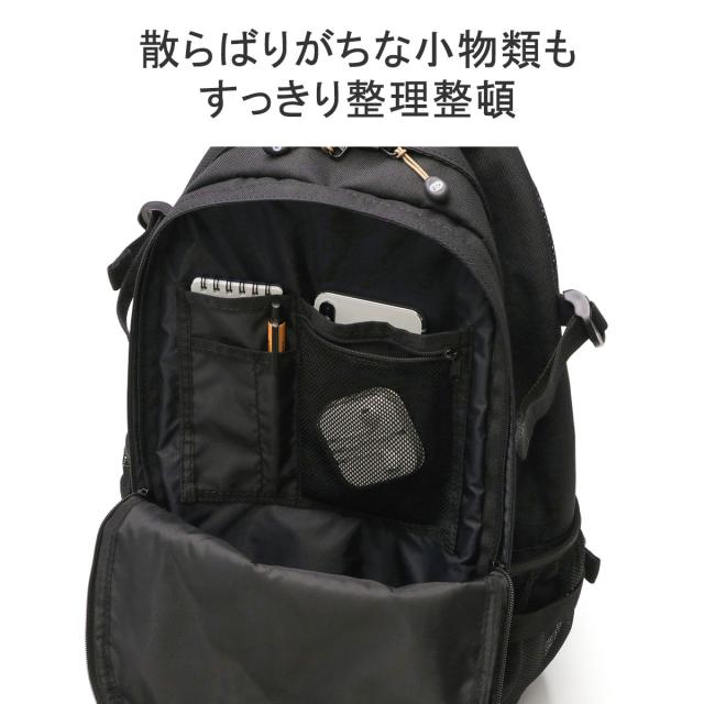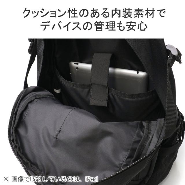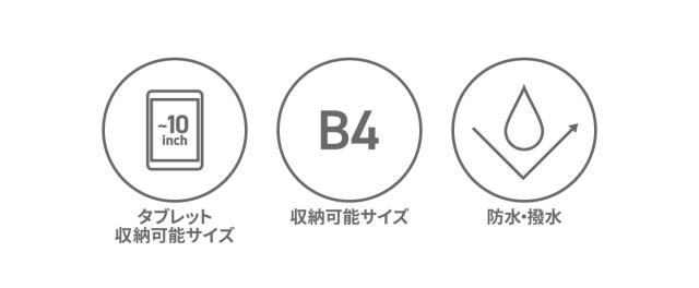 メインスペースは大容量B4サイズ。クッション性に優れたタブレット収納スペースも内蔵されているため、デバイスを携行する際も安心です。また、本体のフロント部分には、メッシュ仕様で中身が確認できるポケットや、小物整理に便利なオーガナイザーポケットを装備。さらに、本体素材には撥水加工が施されているなど、デイリー使いのアイテムに嬉しい機能性を備えているのも魅力的です。