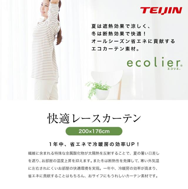 抗菌/UVカット/断熱効果/保温効果/昼・夜目隠し/防臭/防汚/花粉キャッチ、8つの機能が嬉しいテイジン「エコリエ」省エネレースカーテン。UVカット・断熱・保温効果で1年中快適!昼夜ともに高い目隠し効果を発揮します。透けないのに外の光は適度に取り入れます。
