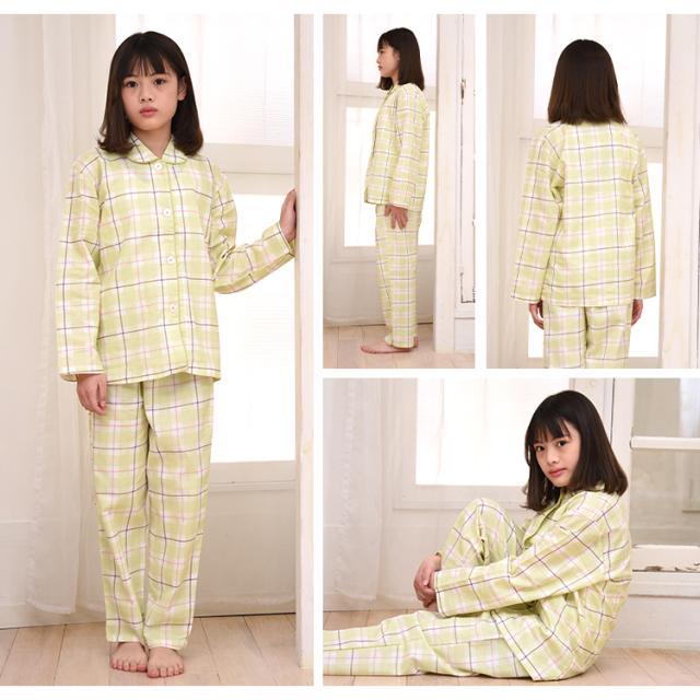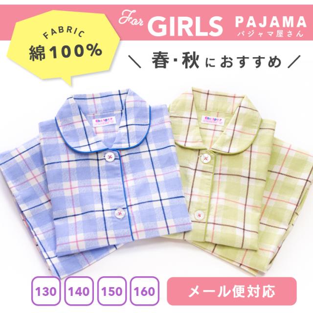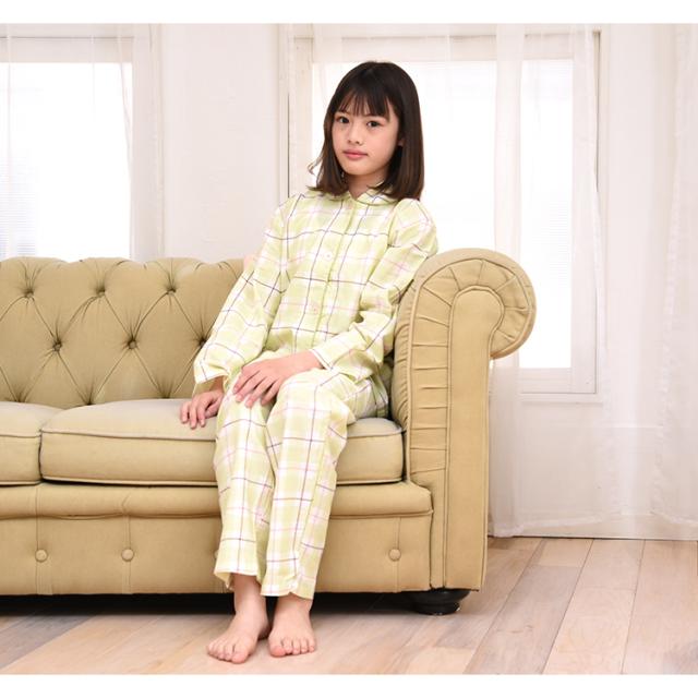 パジャマ キッズ 女の子 綿100% 長袖 春 秋 前開き ボタン ラフチェック柄 サックス ライム 130 140 150 160 子供 ジュニア ガールズ かわいい おそろい メール便なら 送料無料