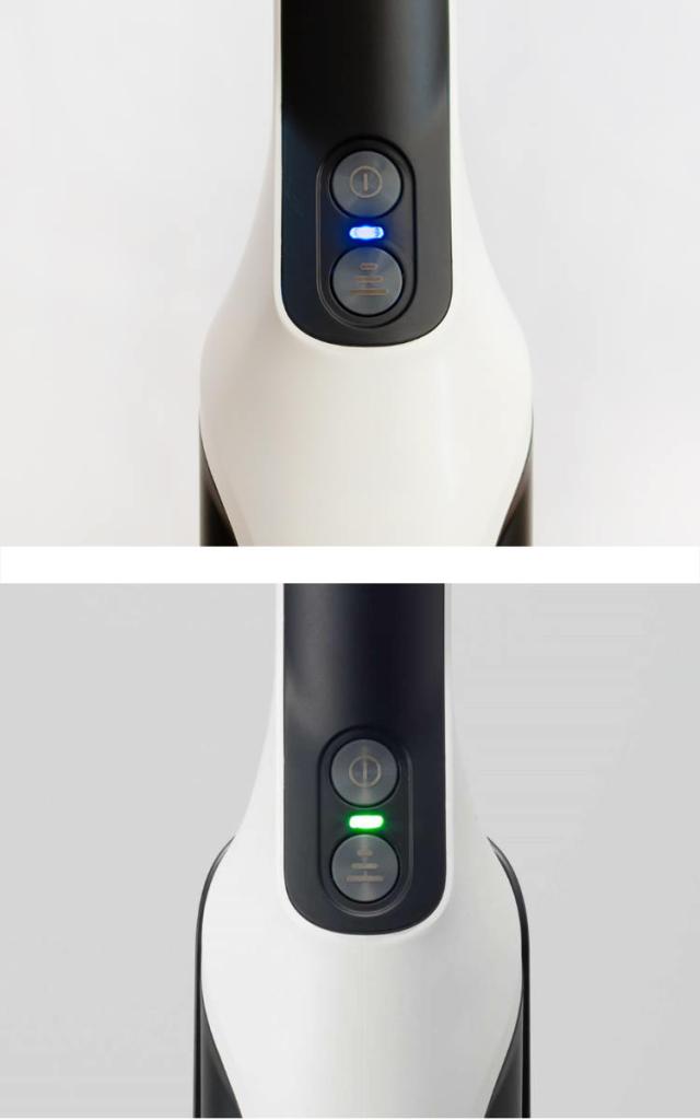 ボタンを押すだけで簡単に作動します。切替スイッチを押すことで強・弱と2段階の吸引力を調整できます。操作方法が簡単なので小さなお子様でもご使用いただけます。また、表示ランプの色で電池の残量を一目で確認できます。電池残量が多い時は青、残量が減ると緑に表示が切り替わります。