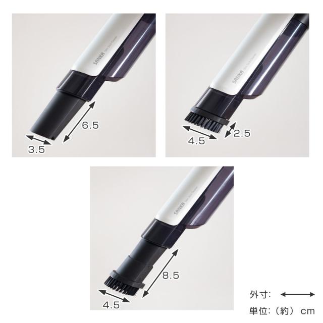 延長パイプを外せば、ハンディクリーナーとしても使用できます。付属のノズルに交換することでお掃除の範囲が広がります。また、二つのノズルは取り付け可能なので、長さを延長してご使用頂けます。