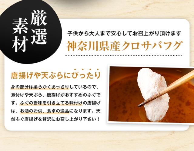 ■原材料名:クロサバフグ、小麦粉(国内製造)、澱粉、食塩、砂糖、粉末魚醤/加工デンプン、調味料(アミノ酸)、(一部に小麦を含む)