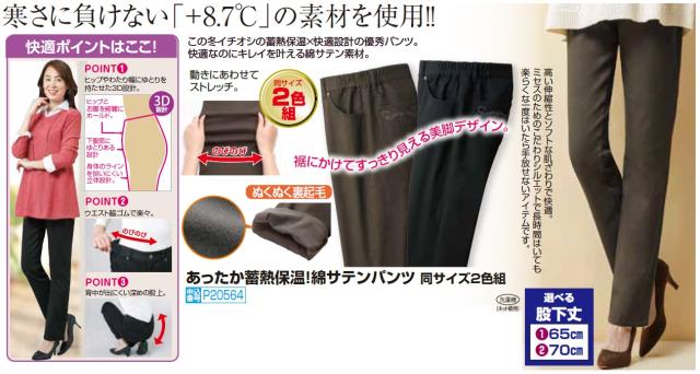 秋冬 あったか蓄熱保温!綿サテンパンツ(2色組) 選べる股下丈 長ズボン レディース 婦人服 ミセス シニア 女性 裏起毛パンツ シニアファッション 50代 60代 70代 80代 母の日 お母さん fri p20564