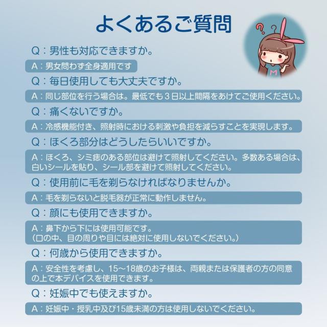 【パッケージ内容】脱毛器本体*1、電源コード *1、サングラス*1、シェーバー*1、日本語取扱説明書*1。 ●ご注意:個人的の肌質や使用部位によって、ムダ毛ケア効果と美顔効果が異なります。