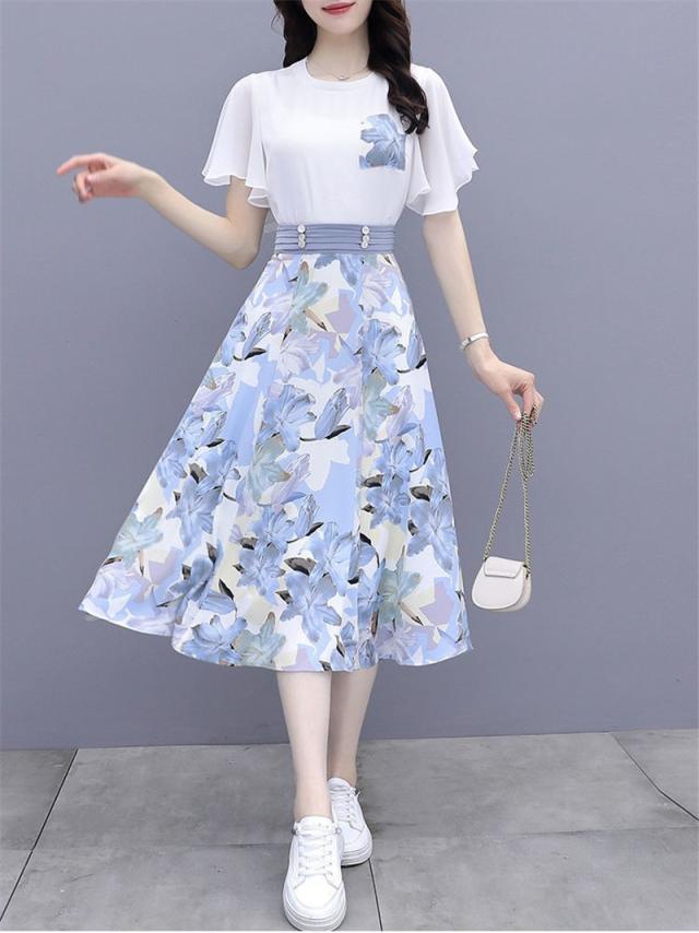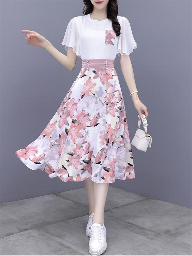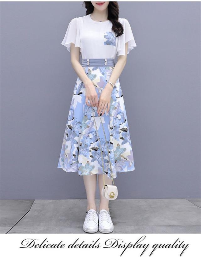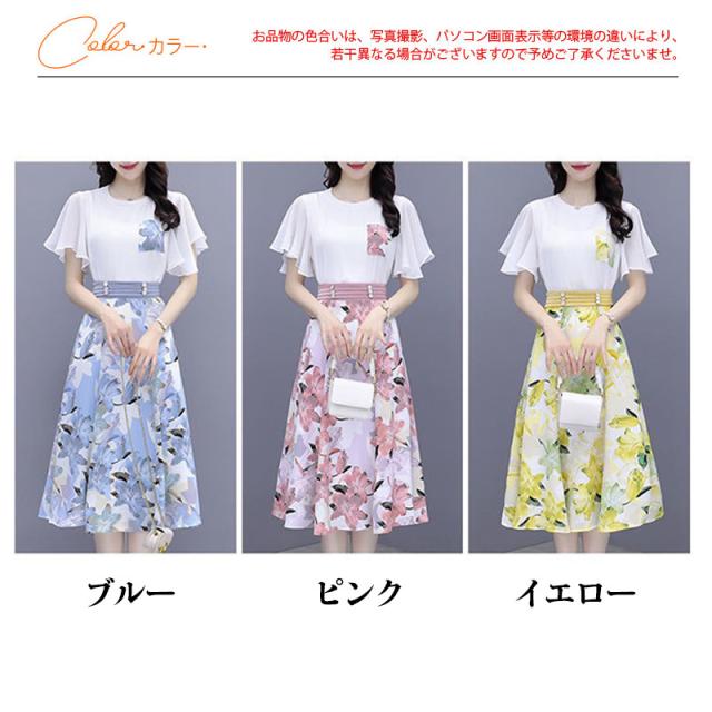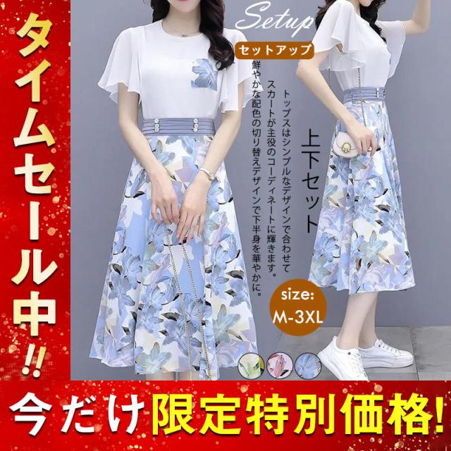 新作 セットアップ レディース Tシャツ スカート 上下セット 膝丈 半袖 フリル フレア 花柄 ハイウエスト 着痩せ 薄手 3色