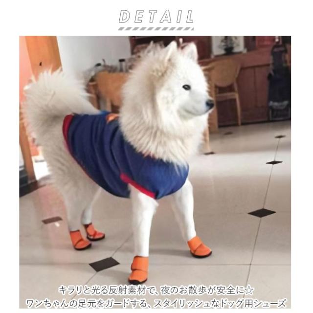 | 商品説明 | ・キラリと光る反射素材で、夜のお散歩が安全に☆ワンちゃんの足元をガードする、スタイリッシュなドッグ用シューズ。 ・冬の乾燥時期や夏の焼けたアスファルト・・・お散歩中のワンちゃんの肉球は傷つきやすくてデリケート。そんな愛犬の足元を守ってくれるワンちゃん専用シューズ! ・シューズの履き口は、幅広ベルトと反射材テープ、2つの面ファスナーのダブルロックで脱げ落ちをしっかり防止。 ・履き口が大きく開き、つま先がすっぽり入って脱ぎ履きが楽ちん。 ・生地にはストレッチ性が高く、動きやすさ抜群のウェットスーツ素材を採用。 ・靴底は程よい弾力のあるゴム素材を使用し、つま先の水濡れや汚れ、路面を歩く時のキズから肉球をガード。 ・足裏には滑り止めの溝がしっかりと刻まれているから、雨の日のお散歩も安心。フローリングの床でもツルツルと滑らず、爪による床のキズも防いで一石二鳥。 ・キラリと光る反射材テープと視認性の高いネオンカラーで、夜間や雨の日のお散歩もより安全に。 ・チワワやポメラニアンなどの小型犬から、ゴールデンレトリバーのような大型犬まで、ワンちゃんの足に合わせてピッタリサイズが選べる5サイズ展開。 |