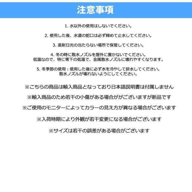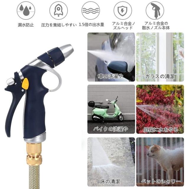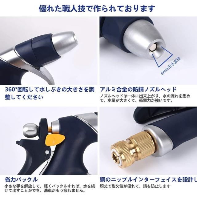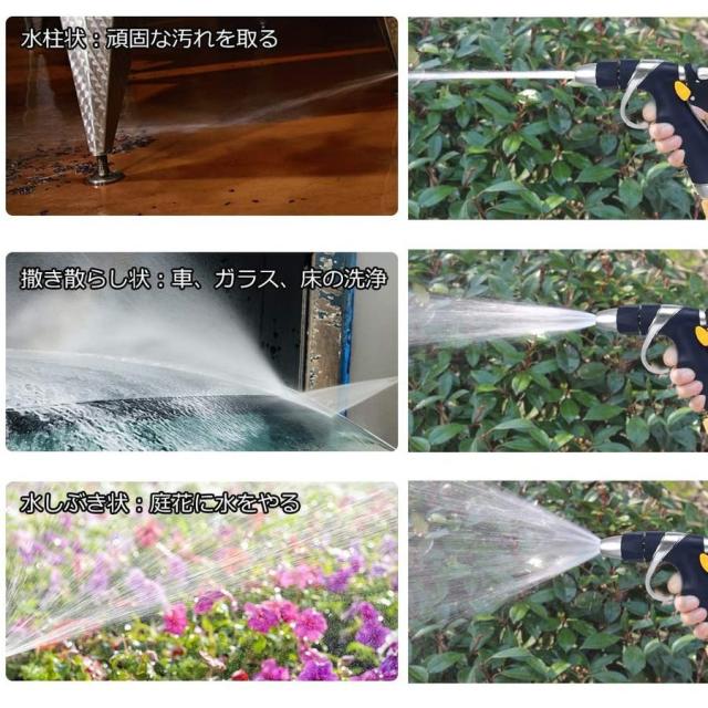 【水圧が大きくて、射程が長い】散水ノズルヘッドを8MMの水出口直径にアップグレードして、ノズルヘッドは一体に出来上がり、水の流れを集めて、水量が大きくて、衝撃力が強いです。水圧と水の出す量が普通の散水ノズルの1.5倍になります。水道水は水ノズルに増圧された後、13-15メートルまで届く。車の洗濯や、ガラス、床の清潔、ペットのシャワーなどに広く使える。