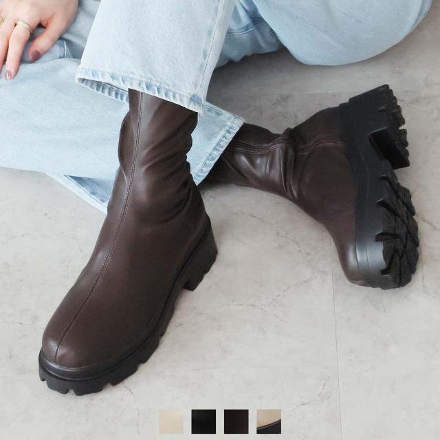 ・人気のボリュームのあるトラックソールの厚底ストレッチブーツは履くだけでで旬スタイルの完成!