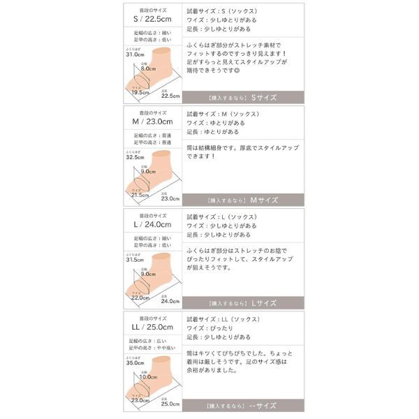 幅:8.1cmヒール高さ:6.0cm筒丈:26.0cm履き口周り:28.0cm足首周り:20.5cmふくらはぎ周り:26.0cm(Mサイズ基準)