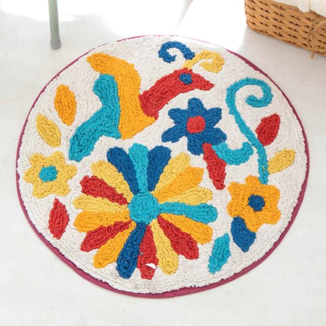 玄関マット 室内用 直径45cm オトミ刺繍 ( 玄関 マット 屋内 室内 厚さ1cm フロアマット ドアマット ラグ 玄関用品 エントランスマット メキシコ 伝統柄 インテリア おしゃれ 花 鳥 カラフル 赤 青 レッド ブルー )