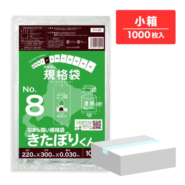 【小箱販売】FH-08kobako 北海道規格 ひもなし 規格袋 8号 0.030mm厚 透明 100枚x10冊 きたぽりくん 食品検査適合 RoHS指定