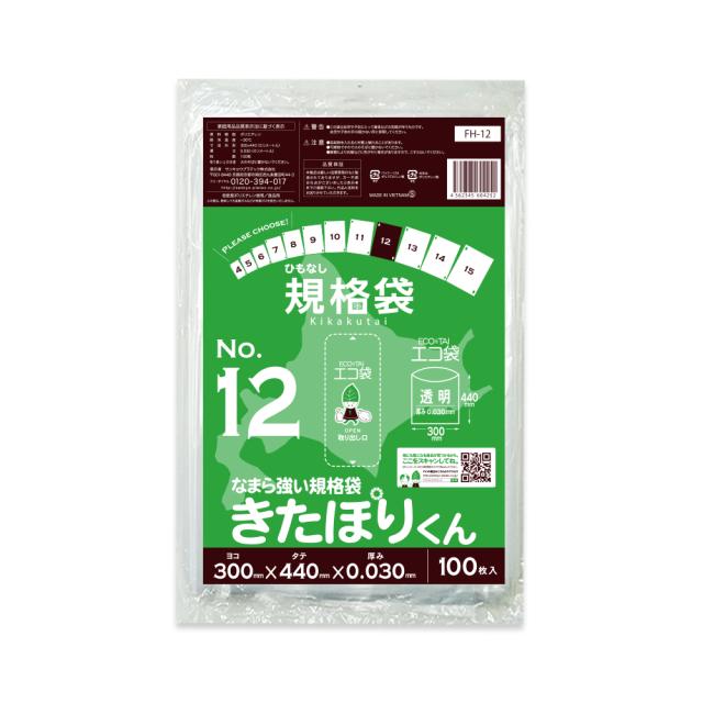 【バラ販売】FH-12bara 北海道規格 ひもなし 規格袋 12号 0.030mm厚 透明 100枚 きたぽりくん 食品検査適合 RoHS指定