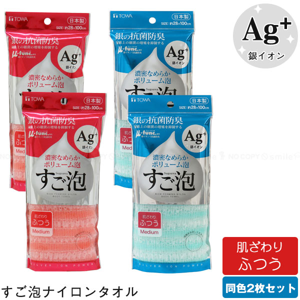 すご泡 銀抗菌 ナイロンタオル ふつう 【2枚セット】 /【ポスト投函送料無料】/ 泡立ち 濃密 なめらか ボリューム 泡 銀 銀イオン 抗菌 防臭 雑菌抑制 66ナイロン 日本製 [TOWA]