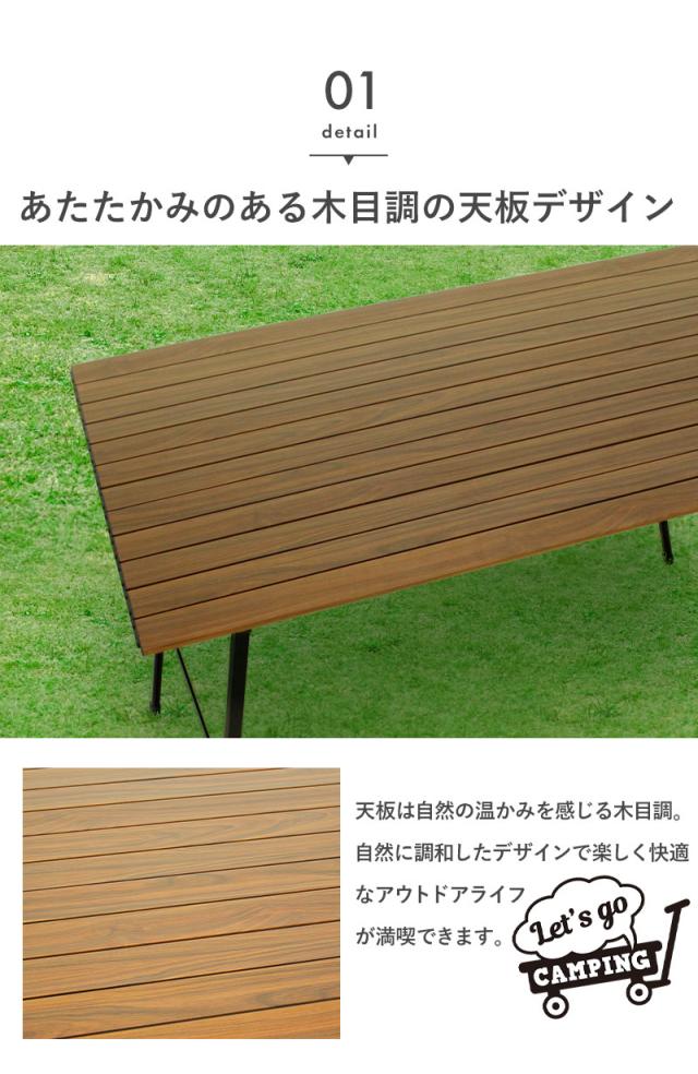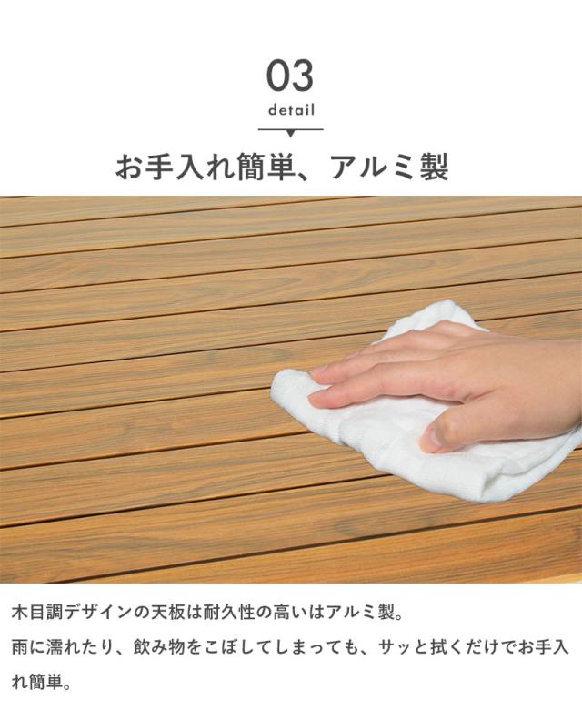 落ち着いた木目調の軽量で丈夫なアルミテーブル。