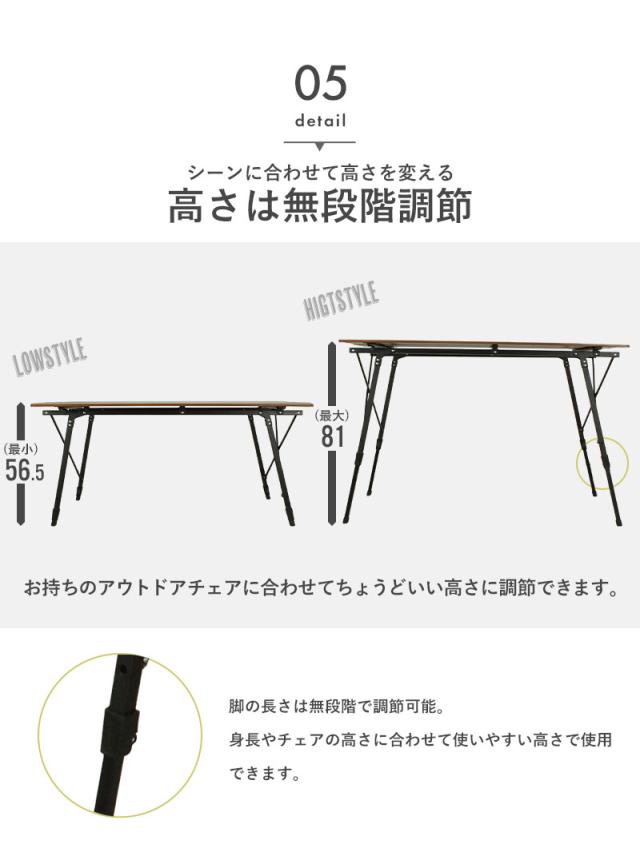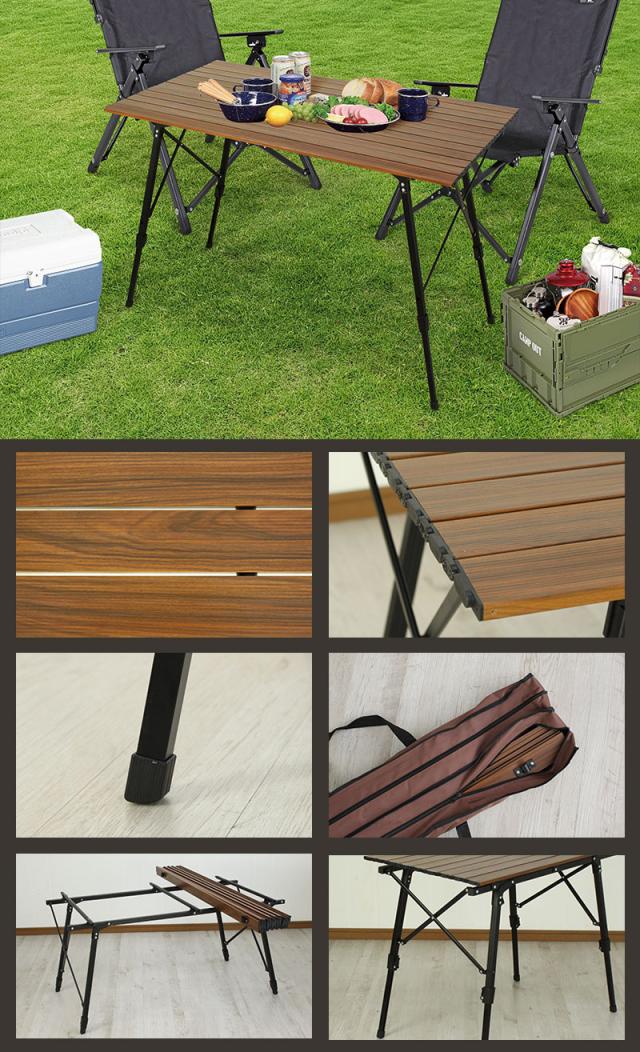 | アルミ製×木目調・ロール天板テーブル。 落ち着いた木目調の軽量で丈夫なアルミテーブル。 天板はロールタイプのため、コンパクトに収納でき、専用の収納ケース付きで携帯性も抜群。 アルミ製なので、汚れ等をサッとふき取れお手入れ簡単。 用途や好みに合わせて無段階で高さ調節ができます。 |