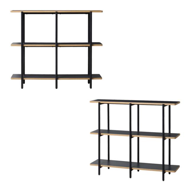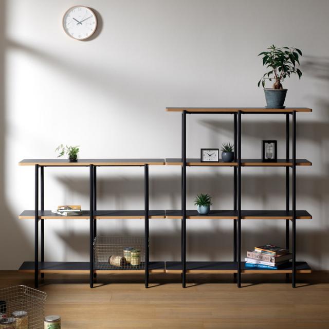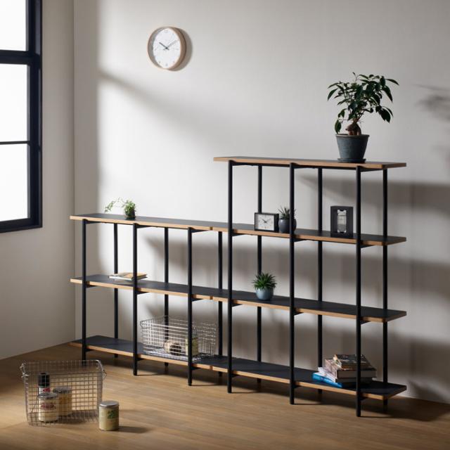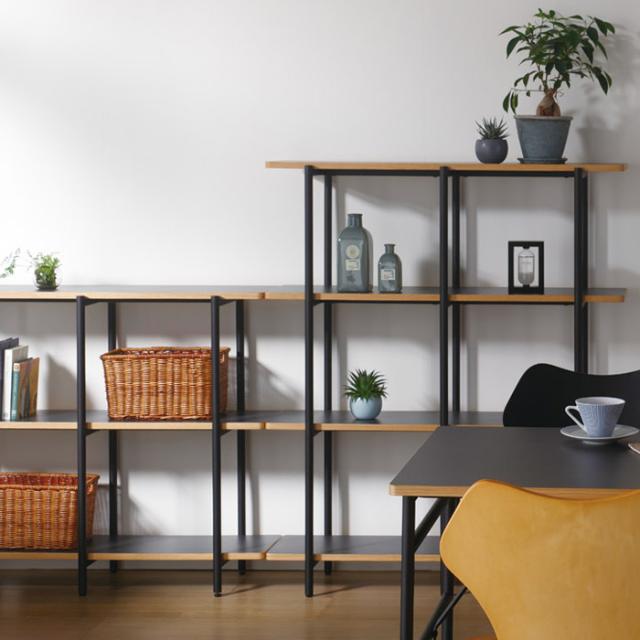 | 傷や汚れに強いメラミンを使用したブラックカラーのボードにはエッジ部分にオーク材をプラス、スマートなフレームを組み合わせたシックなスタイリングのラック。 ブラックの引き締まったカラーリングは、ナチュラルな床に白壁といったシンプルなお部屋にも相性が良く映え、オーク材のアクセントがシックな印象を与えます。 収納棚、飾り棚としてだけでなく、空間の間仕切りにもお勧めです。 |