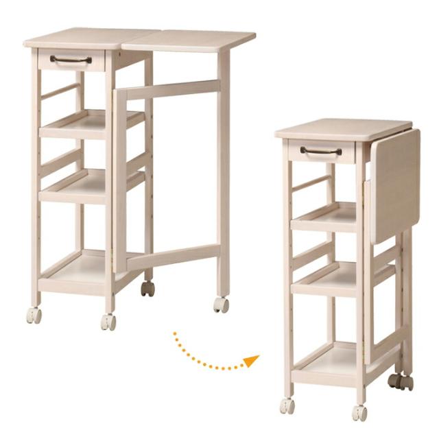 幅32.5cmとスリムなワゴンは、バタフライ天板を広げることで作業スペースが拡張。