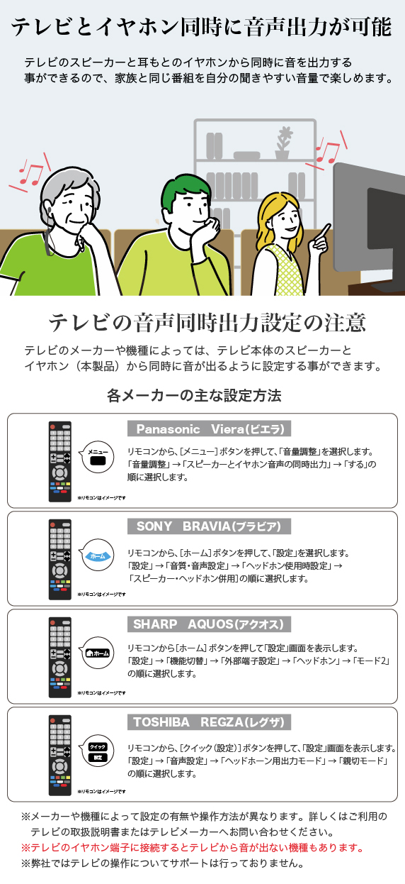 イヤホン端子が付いている全てのテレビで使用することができます。