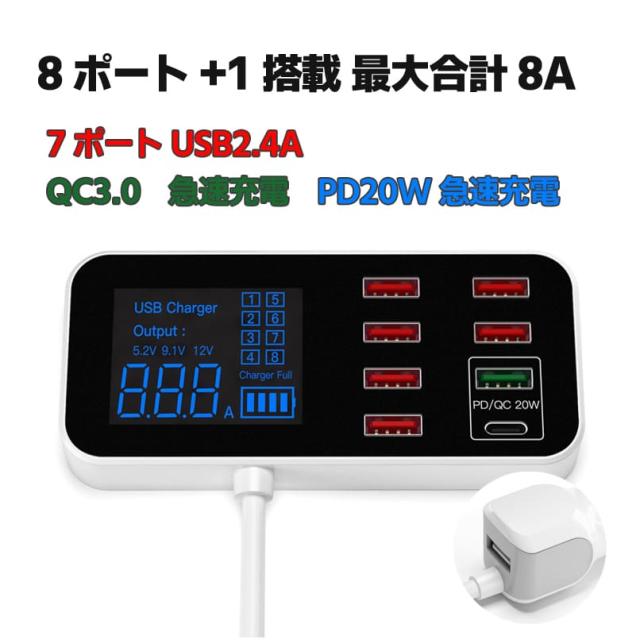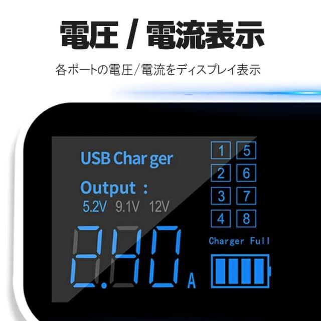 車載USBアダプタ 8ポート(PD&QC) USB増設 QC急速充電 車載充電器 シガーソケットチャージャー 電圧電流表示 CG2USB8P