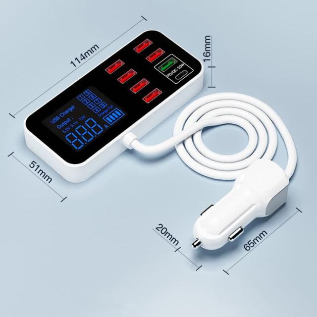 USB 2.4Aポート 6個 + PD(20W)1個 + USB QC3.0 1個 のマルチカーチャージャーです。