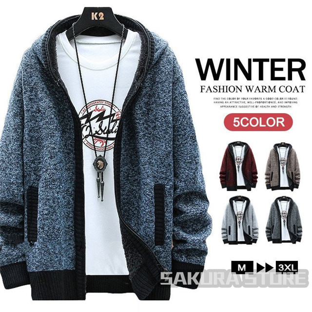 ニットジャケット メンズ 冬服 裏起毛 カーディガン トップス フード付き 秋冬 厚地 あったか メンズファッション