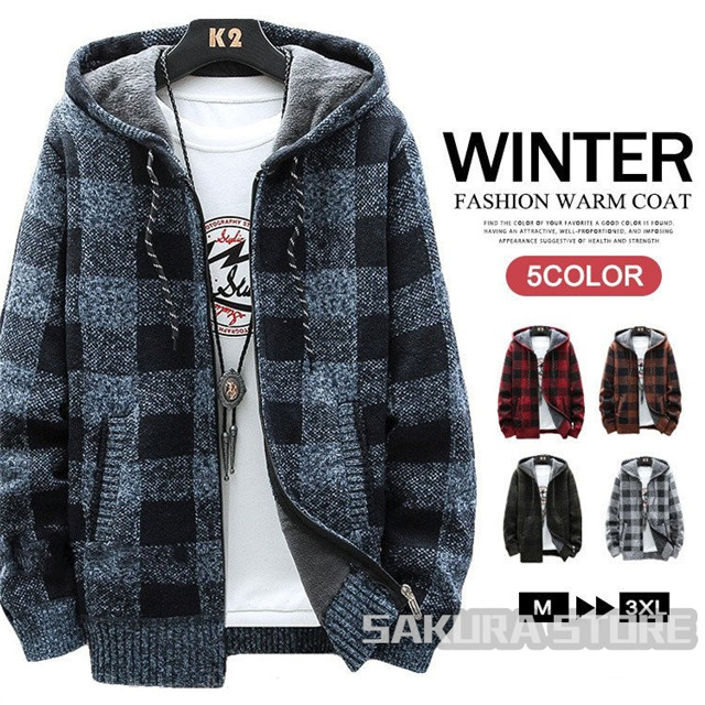 ニットジャケット カーディガン メンズ 冬服 裏起毛 チェック柄 ニット セーター トップス 秋冬 厚地 あったか