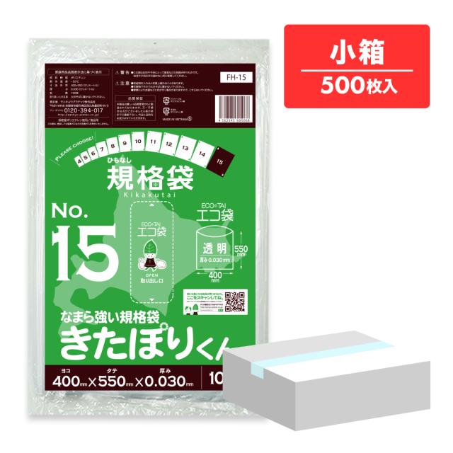 【小箱販売】FH-15kobako 北海道規格 ひもなし 規格袋 15号 0.030mm厚 透明 100枚x5冊 きたぽりくん 食品検査適合 RoHS指定