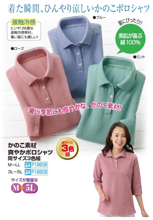 (3L〜5L)かのこ素材爽やかポロシャツ(同サイズ3色組) 接触冷感 五分袖 ポロシャツ レディース 婦人服 ミセス シニア 女性 綿 ピンク ブルー グリーン シニアファッション 50代 60代 70代 80代 母の日 お母さん シンプル 大きいサイズ