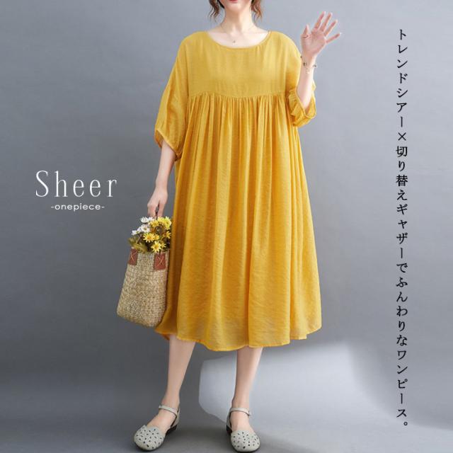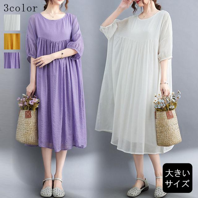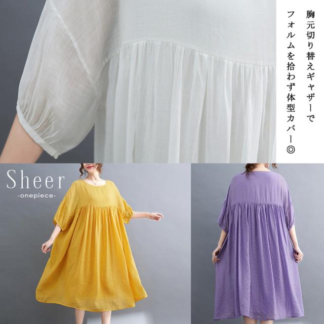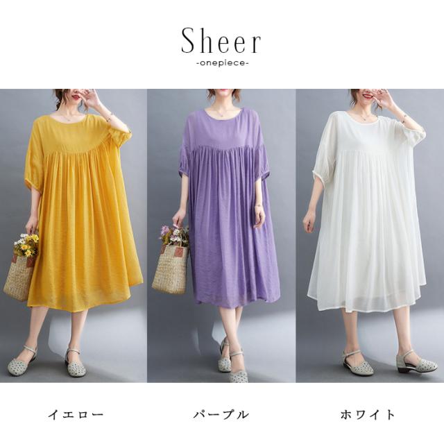 ★☆大きいサイズレディース ワンピース 無地 シアー ギャザーワンピ 膝下 LL 3L 4L 5L 6L パープル ホワイト イエロー 30代 40代 50代☆★
